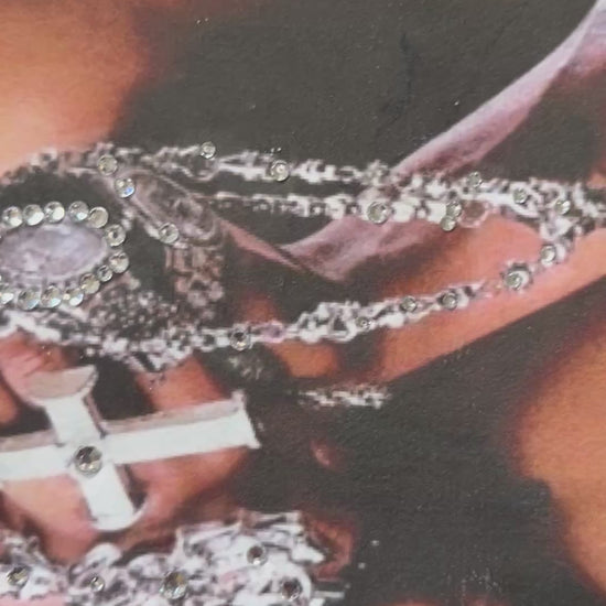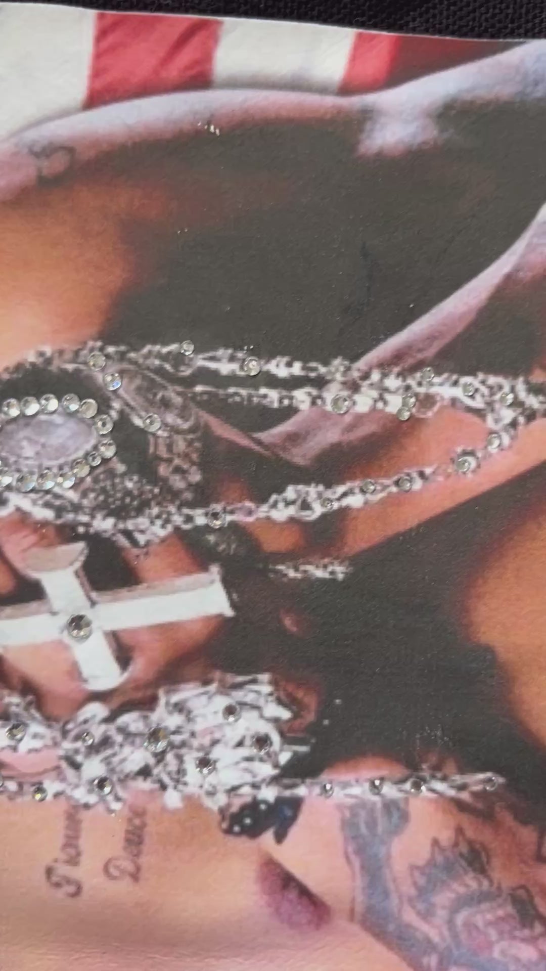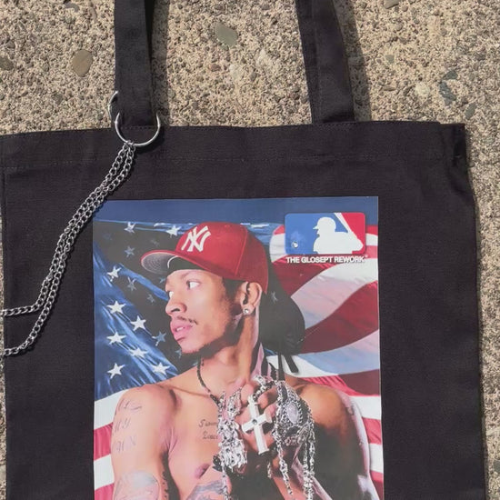 This tote has a portrait of Allen Iverson rocking a NY fitted amidst the American flag backdrop transferred onto the tote. The portrait is embellished with crystal rhinestones to bring to life the jewelry within Iverson’s grasp. Super Icy. MLB Glosept Rework logo to complete the graphic.