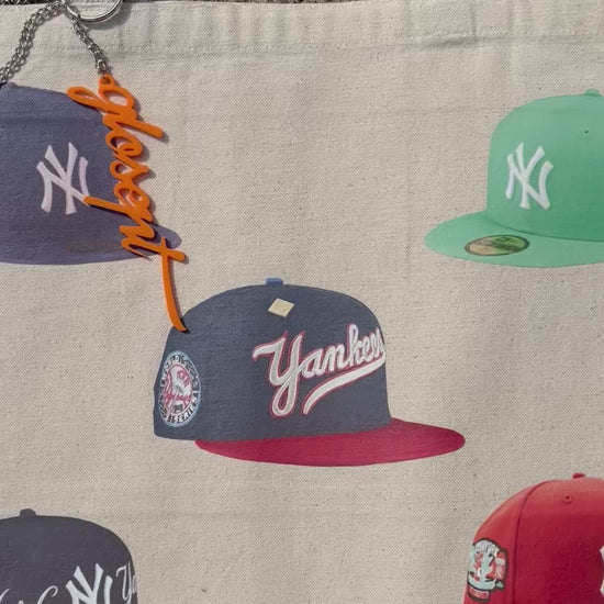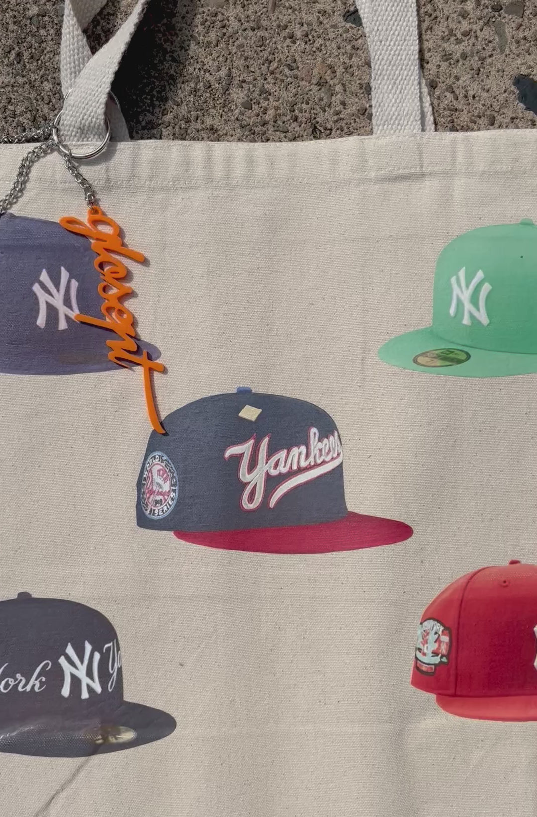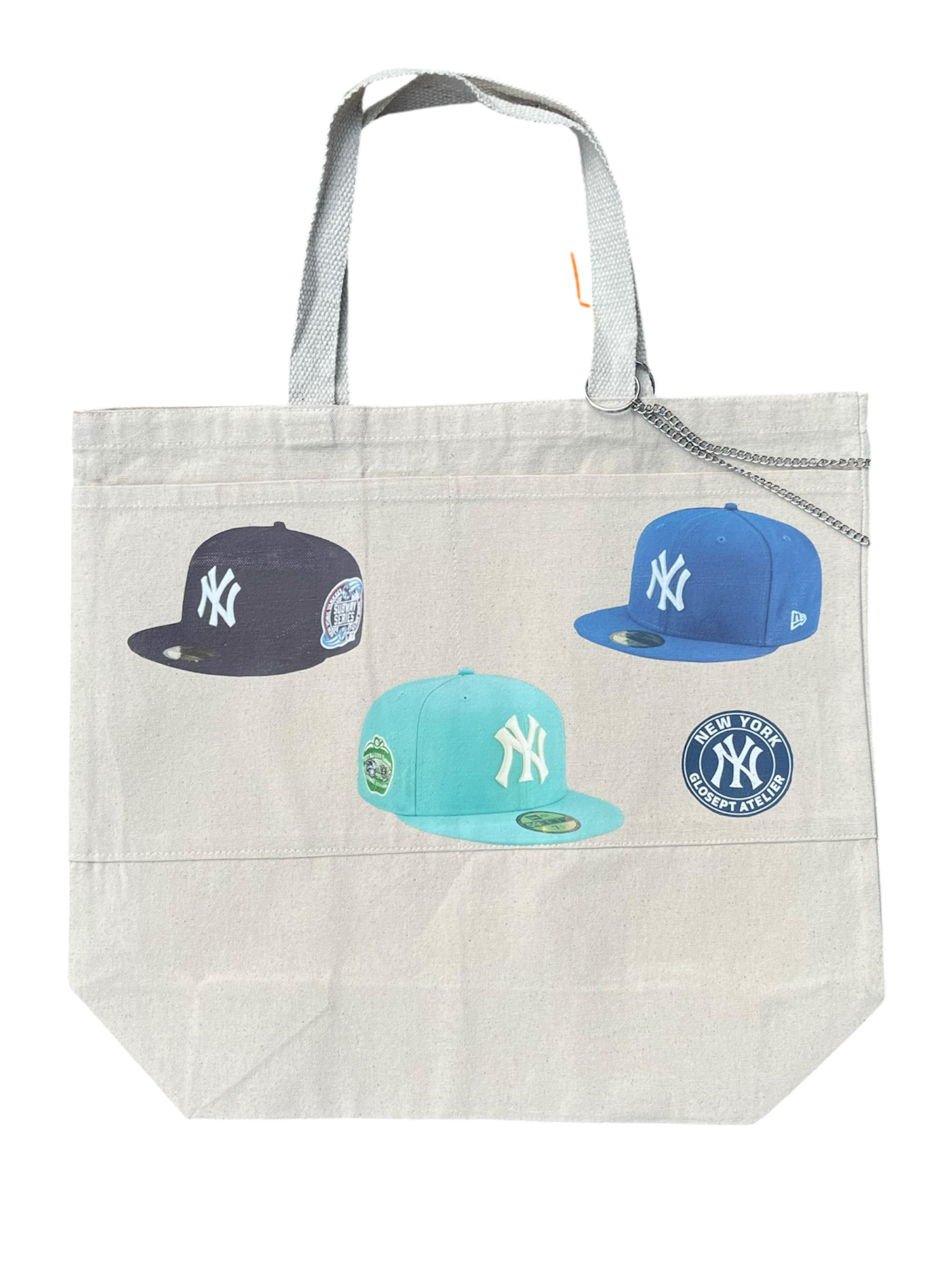 This is the NY fitted tote - a beige colored tote bag with multicolored NY Yankees fitted hats transferred in a pattern. Sealed with a reworked Glosept Atelier classic Yankees logo.