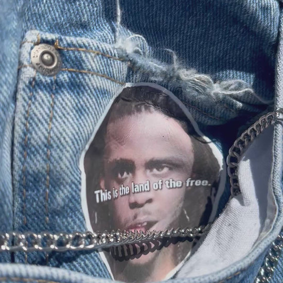 Portrait heat transferred to the bottom right back of leg location & front stash pocket + screen printed logo on left side back pocket.